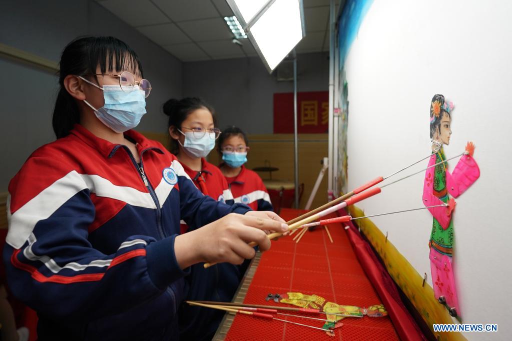 Students play with shadow puppets at the No. 6 Middle School in Shahe City, north China's Hebei Province, April 21, 2021. The middle school has invited local artists to introduce the traditional shadow play to students as a part of effort to have its students better know intangible culture heritage. (Xinhua/Luo Xuefeng)
