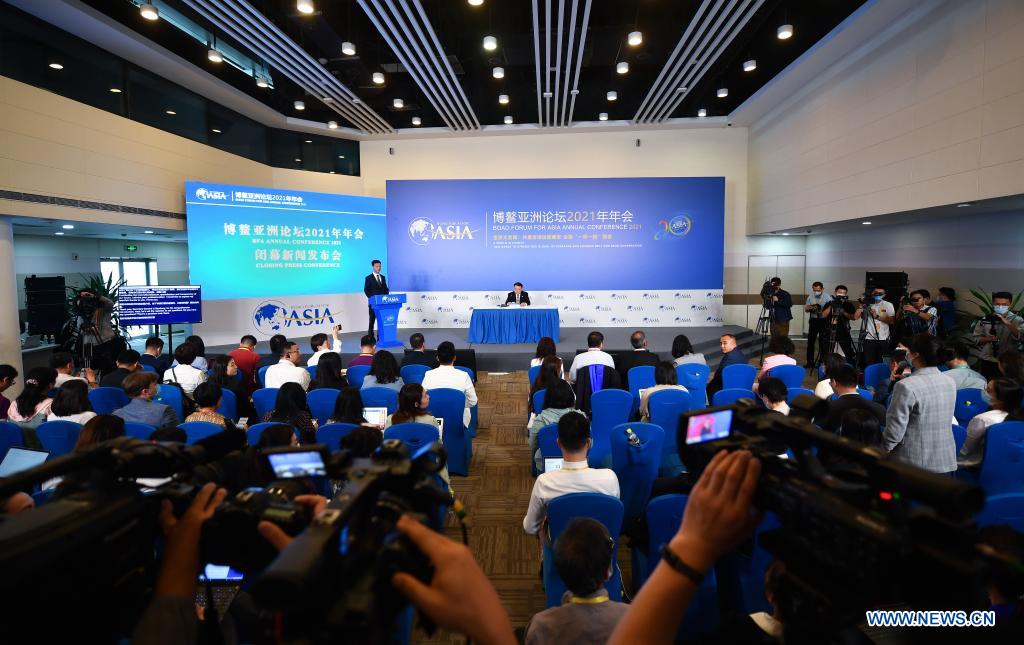 Photo shows the closing press conference of the 2021 Boao Forum for Asia (BFA) annual conference in Boao, south China's Hainan Province, April 21, 2021. The BFA's annual conference concluded here on Wednesday. (Xinhua/Guo Cheng)