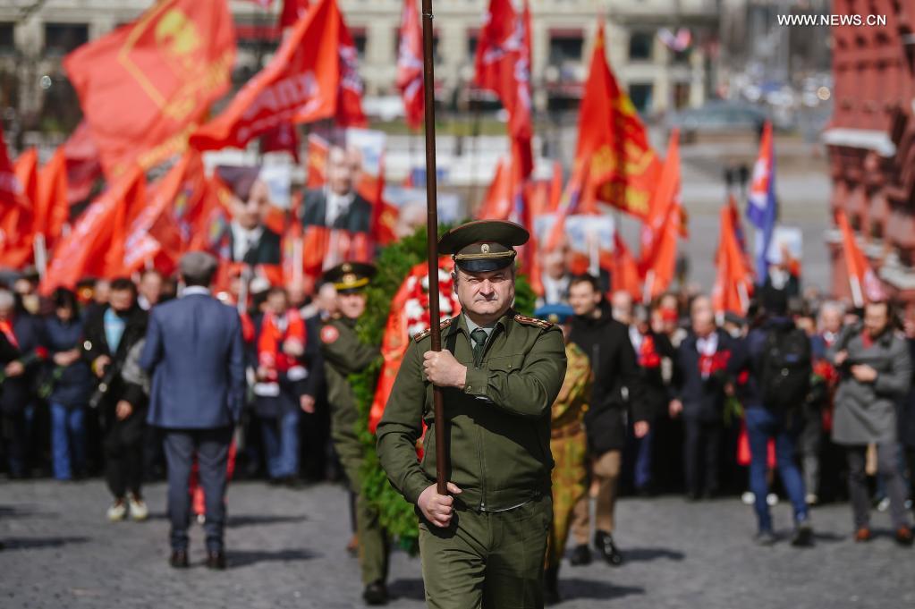 Supporters of the Communist party of Russia (KPRF) attend a flower laying ceremony at Vladimir Lenin's mausoleum to mark the 151st anniversary of the revolutionary leader's birth in Moscow, Russia, on April 22, 2021. (Xinhua/Evgeny Sinitsyny)