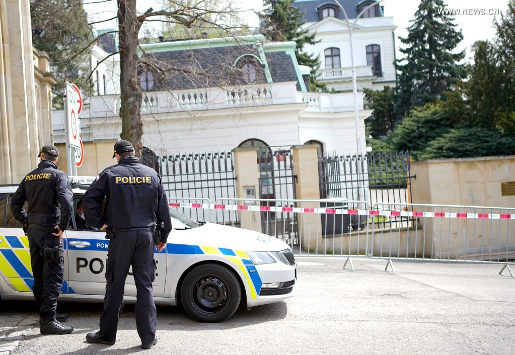Czech police are seen outside the Russian embassy in Prague, the Czech Republic, on April 22, 2021. The Czech Republic will reduce and put a cap on the number of employees in the Russian embassy in Prague to the same number at the Czech embassy in Moscow, the Czech Foreign Ministry said on Thursday. (Photo by Dana Kesnerova/Xinhua)