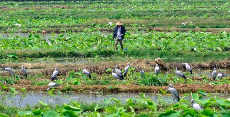 A farmer works in a lotus field in Zhuyuan Township, Mile, Honghe Hani and Yi Autonomous Prefecture, Southwest China's Yunnan Province, April 10, 2021. (Photo by Pu Jiayong/People's Daily Online)