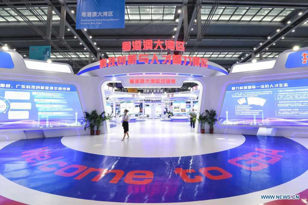 People visit the Science and Technology Innovation and Talent Intelligence Exhibition Area of the Guangdong-Hong Kong-Macao Greater Bay Area during the 19th Conference on International Exchange of Professionals (CIEP) in Shenzhen, south China's Guangdong Province, April 24, 2021. The conference kicked off in China's tech hub Shenzhen on Saturday, attracting over 1,200 professional institutions and organizations as well as over 10,000 government representatives, experts and high-end talents from more than 30 countries and regions. (Xinhua/Mao Siqian)