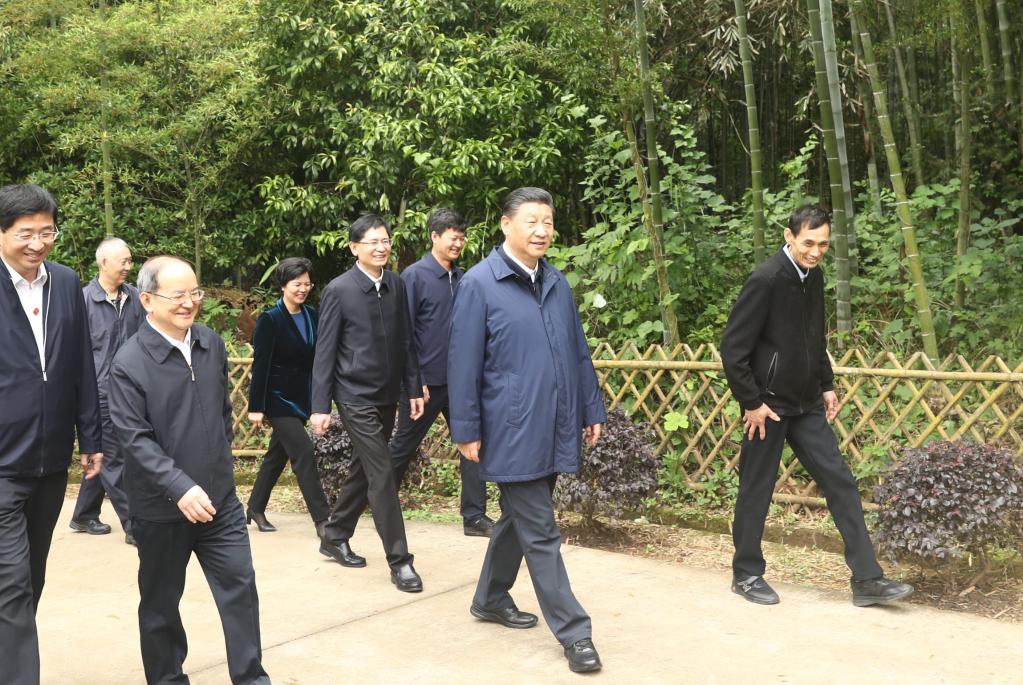 Chinese President Xi Jinping, also general secretary of the Communist Party of China Central Committee and chairman of the Central Military Commission, inspects progress in promoting rural vitalization and grassroots-level governance in Maozhushan village of Caiwan, a town in Quanzhou County in the city of Guilin, south China's Guangxi Zhuang Autonomous Region, April 25, 2021. Xi Jinping on Sunday inspected Guangxi Zhuang Autonomous Region. (Xinhua/Ju Peng)