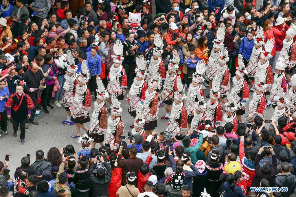People of Miao ethnic group attend a parade to celebrate the Miao Sisters Festival in Taijiang County, Qiandongnan Miao and Dong Autonomous Prefecture, southwest China's Guizhou Province, April 25, 2021. Recognized as a national intangible cultural heritage, the Miao Sisters Festival is celebrated annually around the 15th day of the third lunar month according to the lunar calendar in China. (Xinhua/Yang Wenbin)