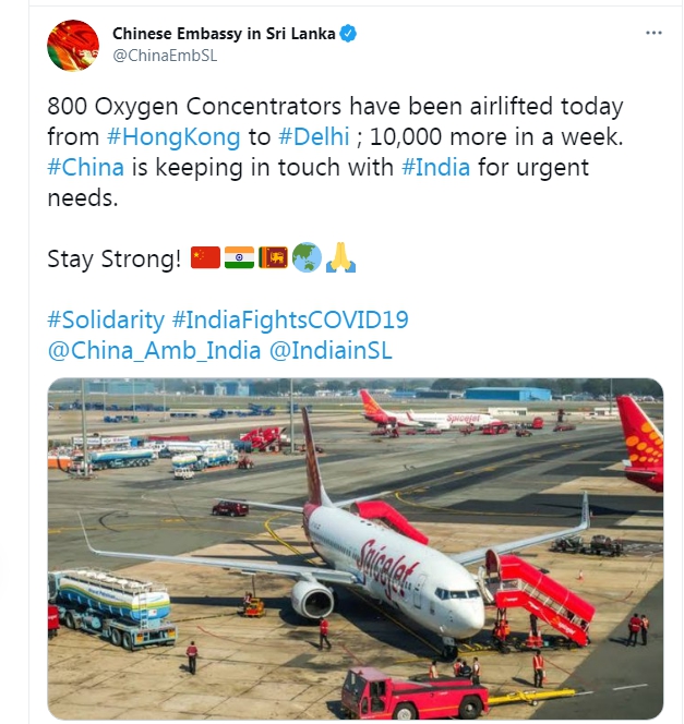 The Chinese Embassy in Sri Lanka tweets that 800 oxygen concentrators were airlifted from China's Hong Kong Special Administrative Region to Delhi and 10,000 will be sent in a week. /@ChinaEmbSL