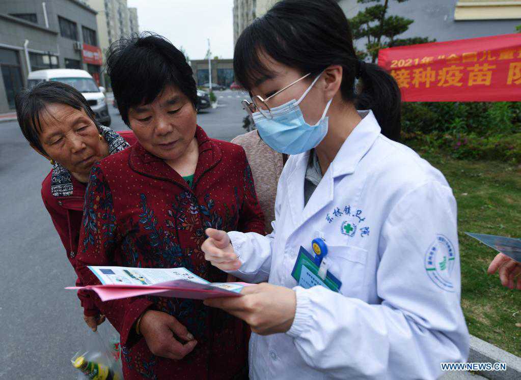 A medical professional informs villagers of the ongoing free-of-charge COVID-19 vaccination campaign at Dongming Village, Donglin Township, Wuxing District, Huzhou City of east China's Zhejiang Province, April 27, 2021. (Xinhua/Xu Yu)