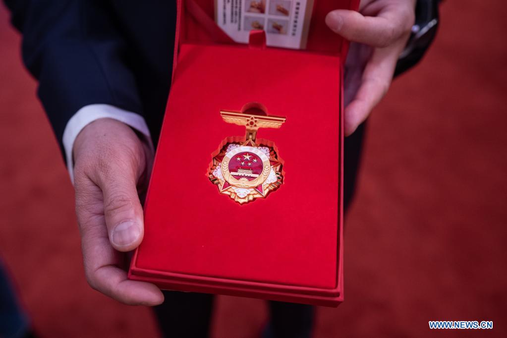 An attendee shows the national labor award medal at a mobilization meeting marking the upcoming Labor Day in Beijing, capital of China, April 27, 2021. A mobilization meeting was held in Beijing on Tuesday to mark the upcoming Labor Day. Exemplary units and workers were granted national labor awards and honorary titles at the meeting. (Xinhua/Cai Yang)
