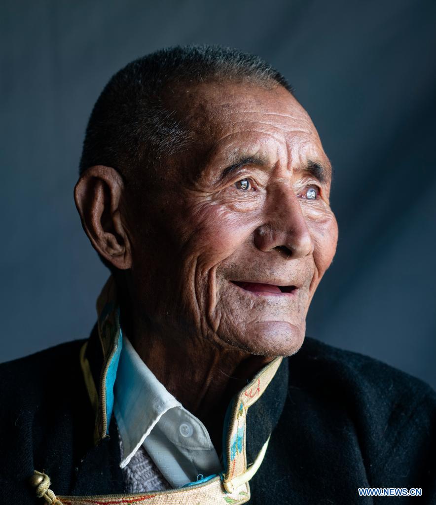 Photo taken on April 16, 2021 shows a portrait of Lhapu at Lin'a Village of Dagze County in Lhasa, southwest China's Tibet Autonomous Region. Lhapu, born in 1938, worked as a serf before the democratic reform in Tibet in 1959, which abolished its feudal serfdom under theocracy. "As part of the production tools, we just did what the lord asked us to do, and were even forbidden to speak loudly," Lhapu recalled his life in the old times, adding that children had no guaranteed food and clothing. After the democratic reform, great changes have taken place in Lhapu"s life. He received some land and built a new house. Now the 83-year-old enjoys a happy life with his children and grandchildren. (Xinhua/Purbu Zhaxi)