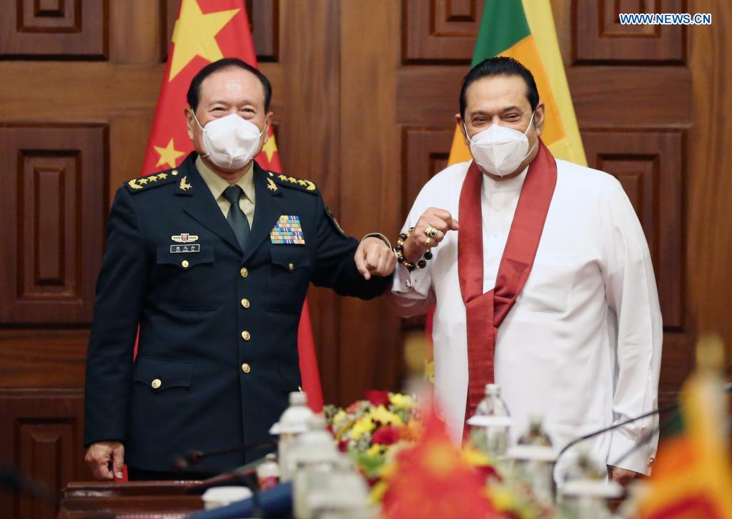 Sri Lankan Prime Minister Mahinda Rajapaksa (R) meets with visiting Chinese State Councilor and Minister of National Defense Wei Fenghe in Colombo, Sri Lanka, on April 28, 2021. (Photo by Ajith Perera/Xinhua)