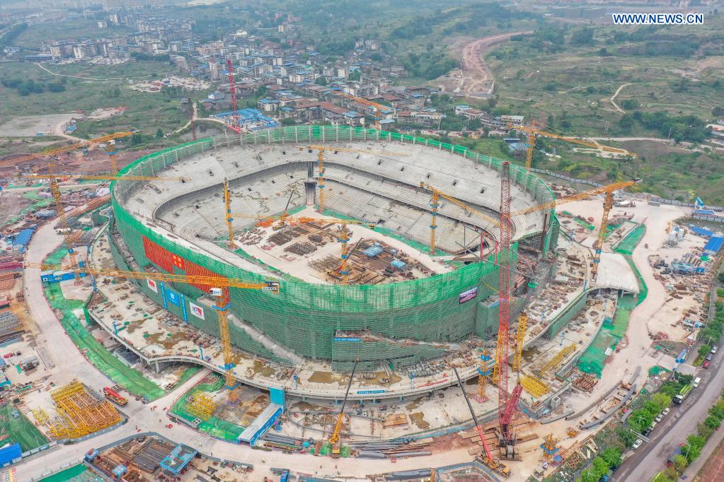 Aerial photo taken on April 28, 2021 shows the construction site of Chongqing Longxing football field in southwest China's Chongqing Municipality. Construction of the main structure of Chongqing Longxing football field was completed Wednesday. When completed, Longxing football field, as a venue of the 2023 AFC Asian Cup, will be able to accommodate 60,000 people to watch the game. (Xinhua/Huang Wei)