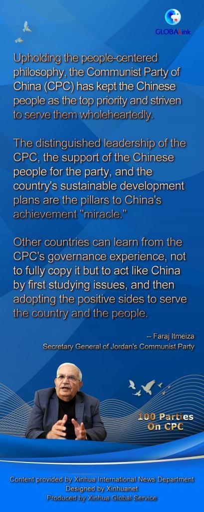 AMMAN, May 6 (Xinhua) -- Upholding the people-centered philosophy, the Communist Party of China (CPC) has kept the Chinese people as the top priority and striven to serve them wholeheartedly, Secretary General of Jordan's Communist Party Faraj Itmeiza has said.