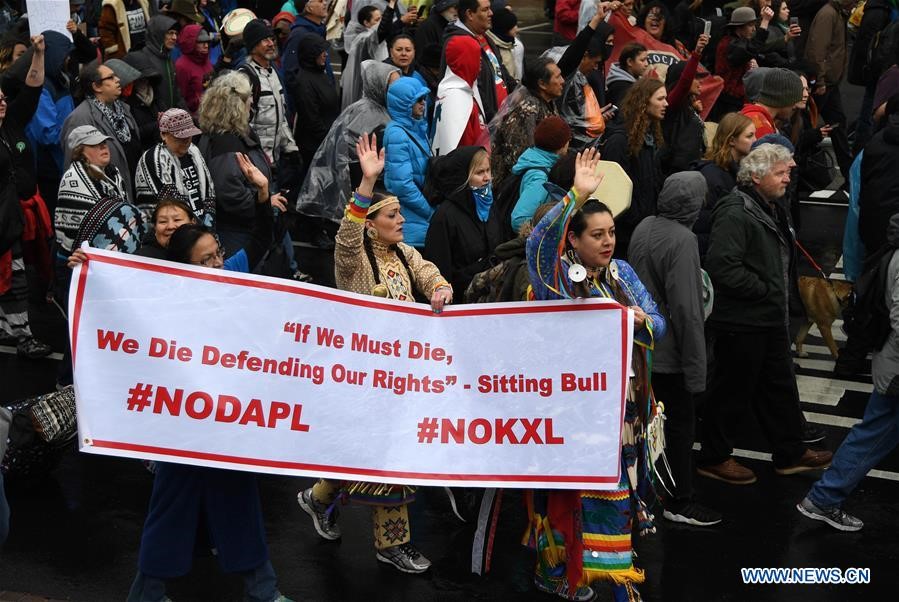Indigenous peoples from numerous nations attend a protest in Washington D.C., the United States, on March 10, 2017. Hundreds of indigenous peoples from numerous nations protested and marched against the Dakota Access pipeline and President Donald Trump. The 3.8-billion-dollar Dakota Access pipeline begins in the Bakken oil fields in North Dakota and runs southeast into Illinois. The project has led to strong protests in North Dakota near the Standing Rock Indian Reservation, as local bands are worried its construction and operation will pollute their drinking water and the natural environment and infringe upon the integrity of their cultural sites. (Xinhua/Yin Bogu)
