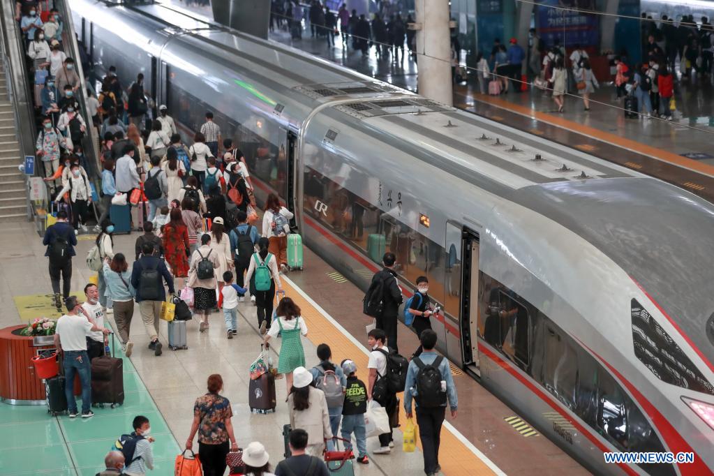Passengers walk to board a high-speed train in Wuhan Railway Station in Wuhan, capital of central China's Hubei Province, May 5, 2021. During the five-day Labor Day holiday, about 4.03 million passenger trips were made via 117 railway stations administered by China Railway Wuhan Bureau Group Co., Ltd. (Photo by Zhao Jun/Xinhua)