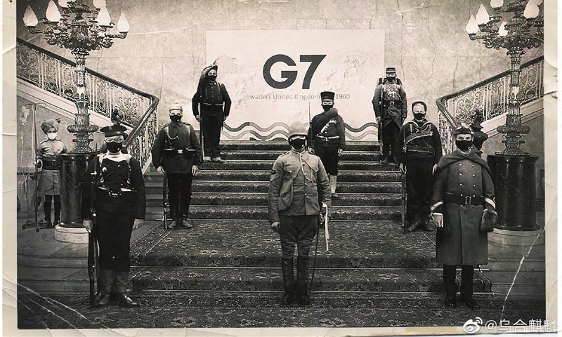 "The last time when these guys colluded to [suppress] China was still in 1900; 120 years have passed, they are still dreaming," patriotic Chinese cartoonist Wuheqilin posted on social media, alongside his new satire illustration on Friday, comparing the meddling of the G7 (or Group of Seven) in China's internal affairs to the notorious invasion of China by the Eight-Nation Alliance troops in 1900.