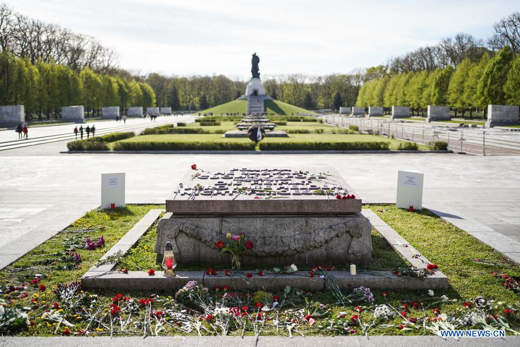 Flowers are laid at the Soviet Memorial in Treptower Park following a gathering to mark the 76th anniversary of the end of World War II in Europe, known as Victory in Europe Day, in Berlin, capital of Germany, May 9, 2021. (Photo by Stefan Zeitz/Xinhua)