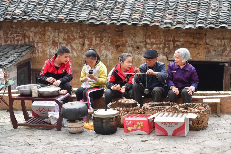 Children help families to sell local specialties in Tongban hamlet, Yajiao Village of Rong'an County, south China's Guangxi Zhuang Autonomous Region, Feb. 15, 2021. (Xinhua/Huang Xiaobang)