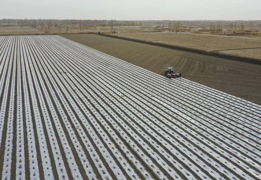 Farmers cover field with plastic films in preparation for cotton sowing in Yuli County, northwest China's Xinjiang Uygur Autonomous Region, March 28, 2021. (Xinhua/Wang Zhipeng)