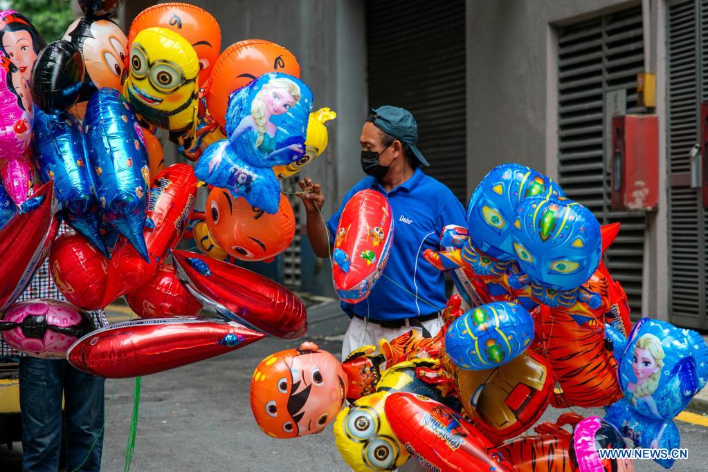 A vendor wearing a face mask sells balloons on a street in Kuala Lumpur, Malaysia, May 12, 2021. Malaysia recorded its highest single-day death toll from COVID-19 on Wednesday after the virus claimed 39 more lives, bringing the total deaths to 1,761, according to the Health Ministry. (Photo by Chong Voon Chung/Xinhua)
