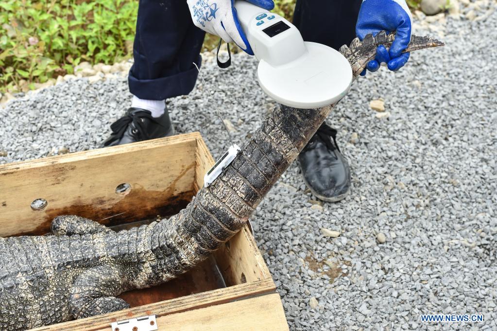 A staff member checks the ID of a Yangtze alligator before release at a release point of the Anhui Chinese alligator national nature reserve in Jingxian County, east China's Anhui Province, May 13, 2021. The nature reserve on Thursday released 51 artificially bred Yangtze alligators, also known as Chinese alligators, into the wild, with another 479 planned to be set free at different release points in the reserve. The nature reserve has begun reintroducing the endangered reptiles into the wild since 2003, and as of 2020, a total of 508 Chinese alligators have been released in 16 batches. (Xinhua/Han Xu)