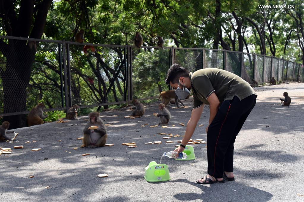 A volunteer feeds monkeys during a lockdown to prevent the spread of COVID-19 pandemic in Jammu, the winter capital of Indian-controlled Kashmir, May 13, 2021. (Str/Xinhua)