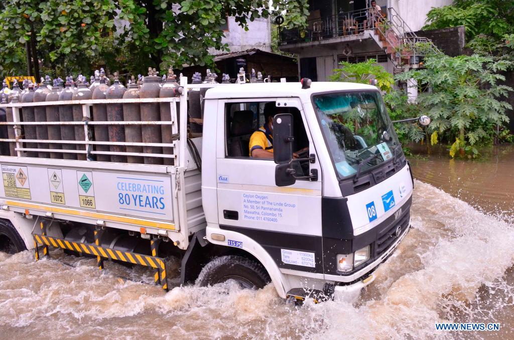 Atruck carrying oxygen cylinders moves along a flooded road in Gampaha, Sri Lanka, May 15, 2021. At least four people had died and over 42,000 others had been affected by days of strong winds and heavy rains which lashed the country due to the formation of a super cyclone in the Bay of Bengal, Sri Lanka's Disaster Management Center (DMC) said in its latest weather report Saturday. (Photo by Gayan Sameera/Xinhua)