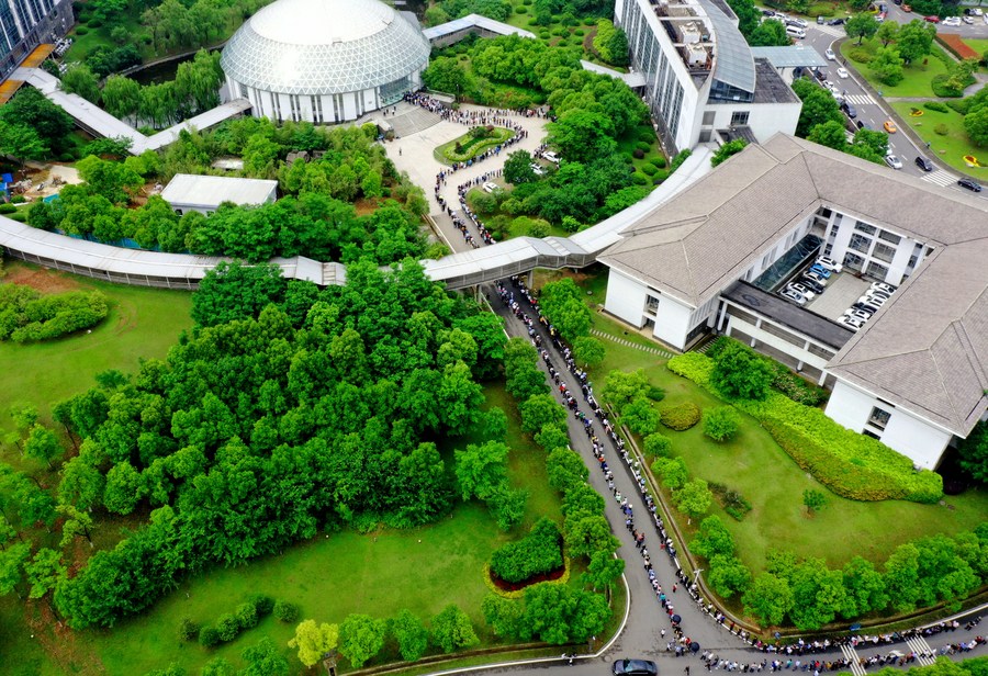 Aerial photo taken on May 14, 2021 shows people waiting for nucleic acid sampling at a testing site in Lu'an City, east China's Anhui Province. (Photo by Chen Li/Xinhua)