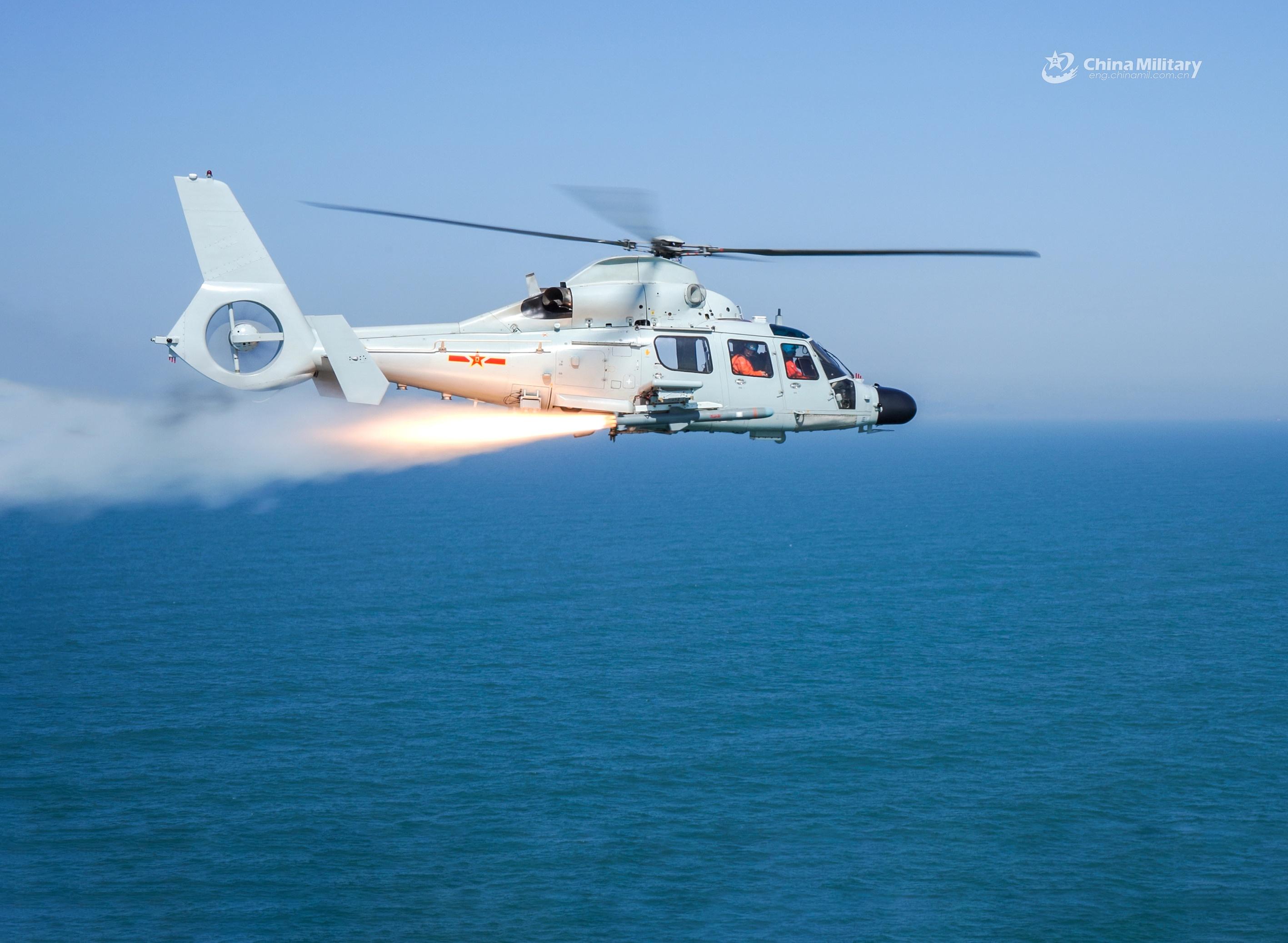 A ship-borne helicopter attached to an naval aviation regiment under the PLA Eastern Theater Command fires a missile at mock target during a live-fire training exercise in early May, 2021. (eng.chinamil.com.cn/Photo by Sun Wei)