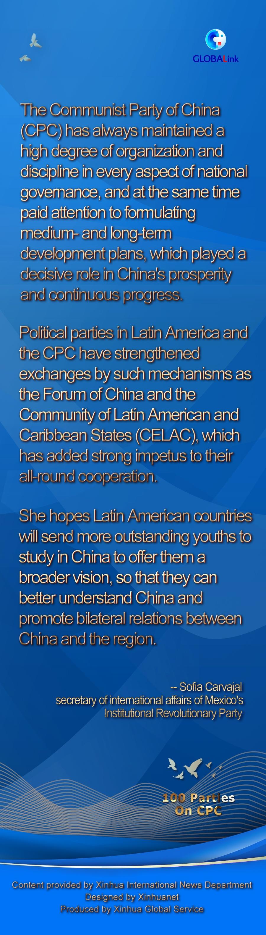 In a recent interview with Xinhua, Sofia Carvajal, secretary of international affairs of Mexico's Institutional Revolutionary Party (PRI), said that her party has been established for more than 90 years and has maintained adequate and diverse inter-party exchanges with the CPC.
