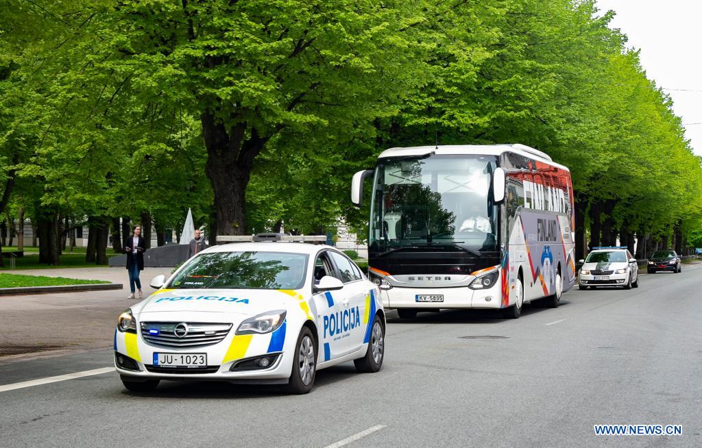 The bus of team Finland is escorted to practice arena by police before the 2021 IIHF Ice Hockey World Championship in Riga, Latvia, on May 20, 2021. The Ice Hockey World Championship will kick off in Riga on May 21, with the final scheduled for June 6. (Photo by Edijs Palens/Xinhua)