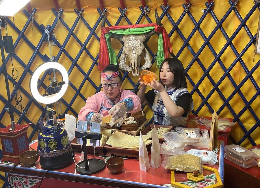 Photo taken on May 12, 2021 shows two salespersons of an e-commerce company selling products via livestreaming in Hinggan League, north China's Inner Mongolia Autonomous Region. (Xinhua/Zhang Yuyang)