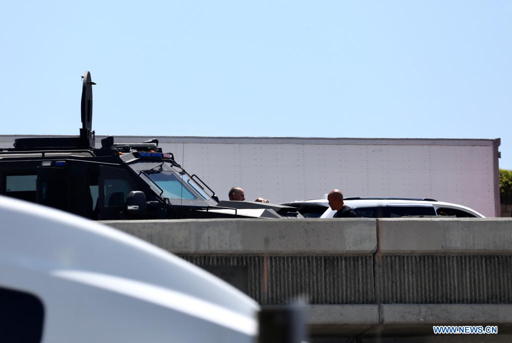 Police officers investigate at the scene where the gunman was killed in Fullerton shootout in Los Angeles, California, the United States, April 27, 2021. (Xinhua)