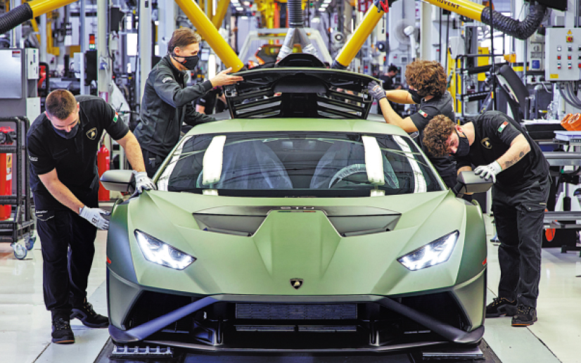 Workers assemble a model on a Lamborghini production line. The luxury sports car and SUV maker will roll out its first electric model after 2025. [Photo/China Daily]