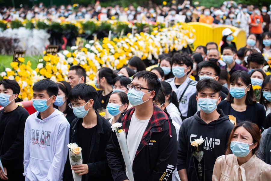 Despite being a busy workday, thousands of people dressed in black showed up and laid flowers at the site before the service began at 10 a.m. in Changsha, capital of central China's Hunan Province.