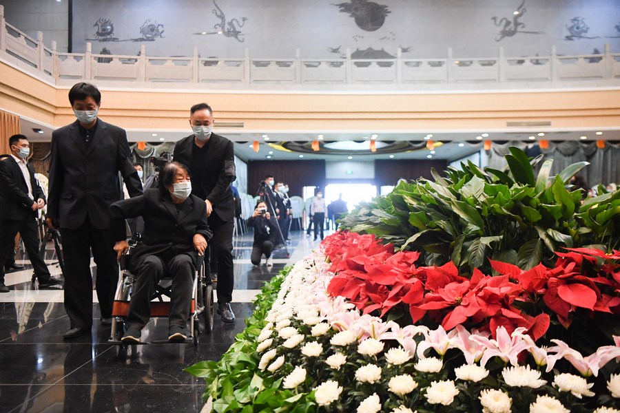 Deng Ze, wife of deceased scientist Yuan Longping, attends his funeral at the Mingyangshan funeral parlor in Changsha, central China's Hunan Province, May 24, 2021. (Xinhua/Xue Yuge)