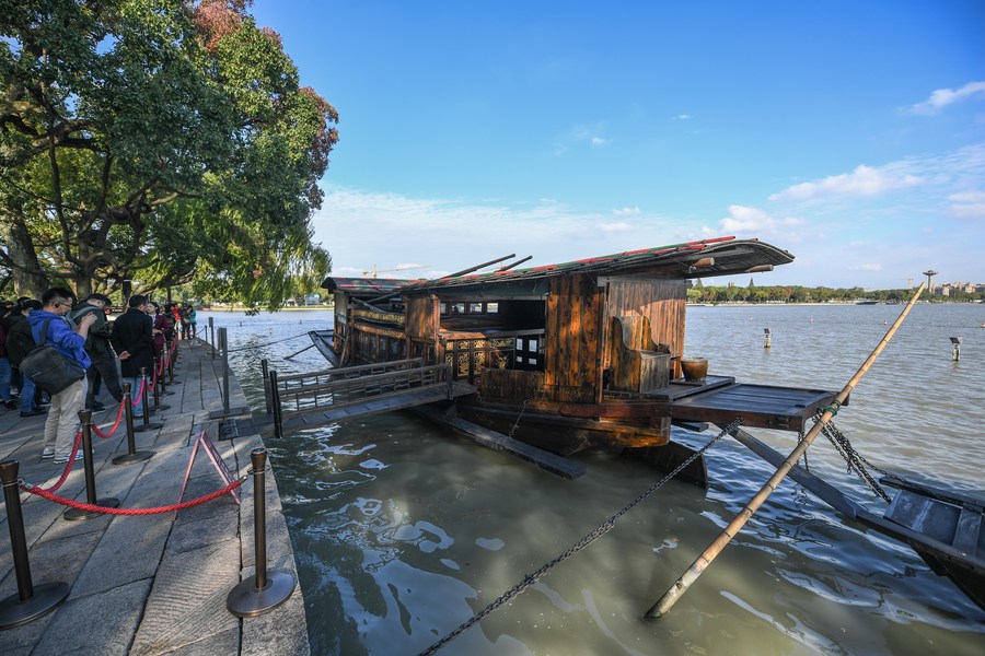 Photo taken on Oct. 27, 2020 shows the replica of a boat, now referred to as the Red Boat, on which the founders of the Communist Party of China convened a historic meeting in 1921, on Nanhu Lake in Jiaxing, east China's Zhejiang Province. (Xinhua/Xu Yu)