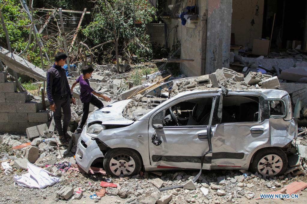 Palestinians are seen near destroyed buildings in the northern Gaza Strip town of Beit Hanoun, on May 24, 2021. Calm is returning to Gaza as the cease-fire between Israel and Hamas has held since it went into effect on Friday, said the UN Office for the Coordination of Humanitarian Affairs (OCHA) on Monday. (Photo by Rizek Abdeljawad/Xinhua)