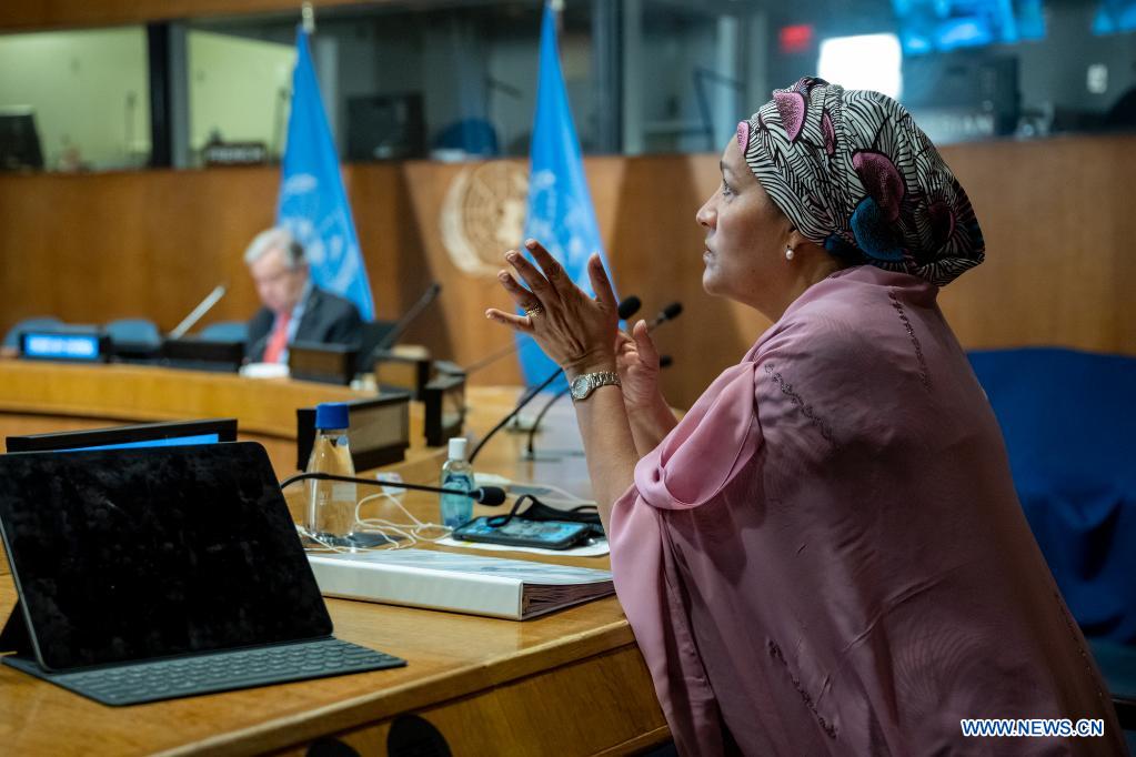 United Nations Deputy Secretary-General Amina Mohammed addresses a virtual global roundtable on transforming extractive industries for sustainable development at the UN headquarters in New York, on May 25, 2021. UN Secretary-General Antonio Guterres on Tuesday called for a transformation of extractive industries to support sustainable development and a transition to a green economy. (Mark Garten/UN Photo/Handout via Xinhua)