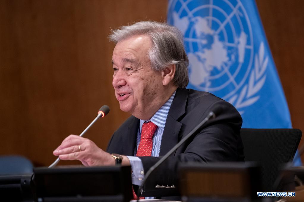 United Nations Secretary-General Antonio Guterres addresses a virtual global roundtable on transforming extractive industries for sustainable development at the UN headquarters in New York, on May 25, 2021. Guterres on Tuesday called for a transformation of extractive industries to support sustainable development and a transition to a green economy. (Mark Garten/UN Photo/Handout via Xinhua)