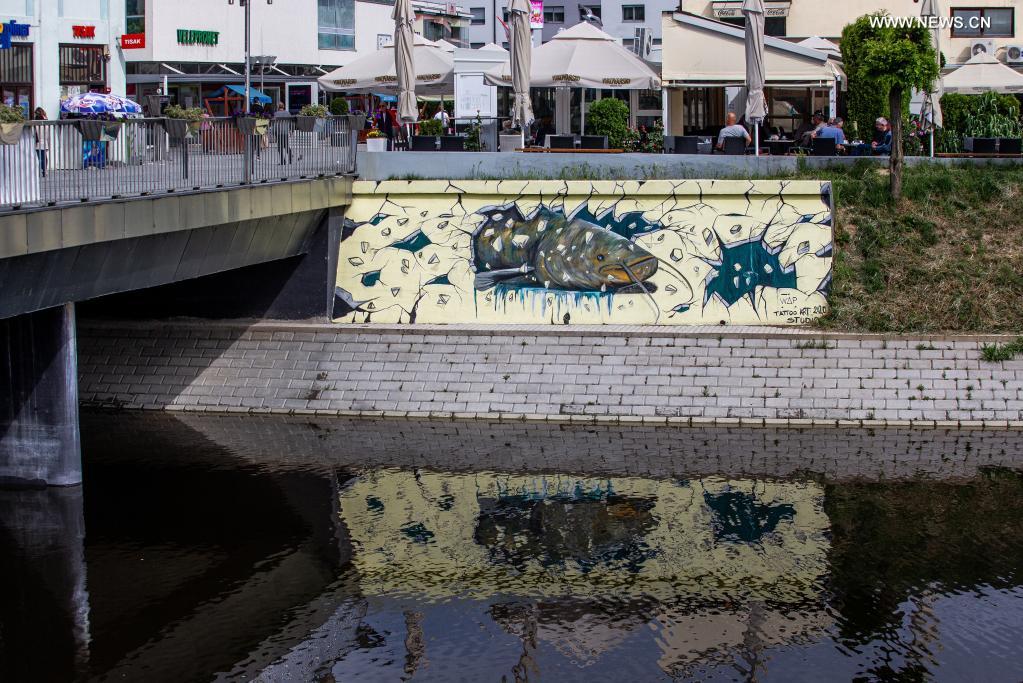 A mural is seen on the river bank in Vukovar, Croatia, May 27, 2021. Street art festival VukovART, which features murals created by world-famous artists on the walls and sidewalks, is held in Vukovar for the fifth year in a row. (Davor Javorovic/Pixsell via Xinhua)