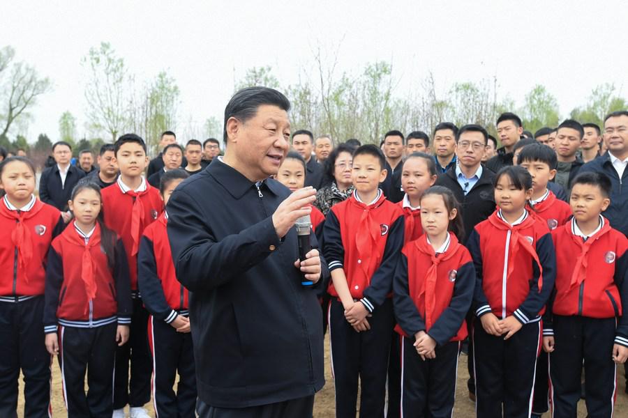 Chinese President Xi Jinping, also general secretary of the Communist Party of China Central Committee and chairman of the Central Military Commission, talks with the officials, people and school children on-site during a tree-planting activity in Chaoyang District in Beijing, capital of China, April 2, 2021. (Xinhua/Li Xueren)