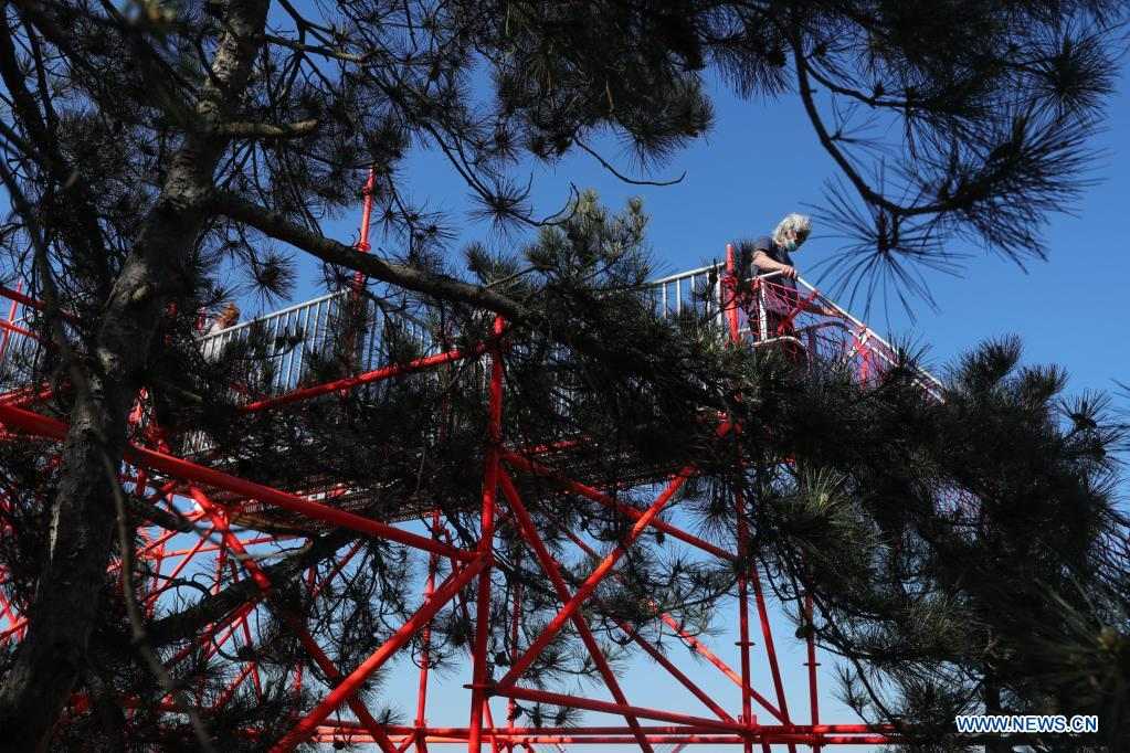 People experience the art installation "Strangler" by Hector Zamora in Bruges, Belgium, June 1, 2021. From May 8 to Oct. 24, the third Triennial Bruges brings contemporary art and architecture to the city with rich history. With the theme "TraumA," art pieces created by thirteen artists and architects were shown in different places in the city. (Xinhua/Zheng Huansong)
