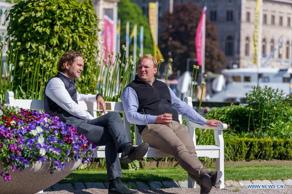 People enjoy the sunshine in a park in Stockholm, Sweden on June 1, 2021. From June 1, Sweden has started the first steps to ease the country's COVID-19 restrictions, meaning that restaurants can open longer, and public events can accommodate more people. (Photo by Wei Xuechao/Xinhua)
