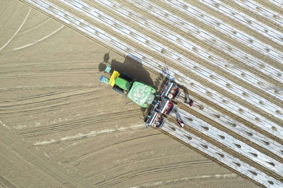 A farm machine works in a field in Yuli County, northwest China's Xinjiang Uygur Autonomous Region, March 28, 2021. (Photo by Wang Zhipeng/Xinhua)