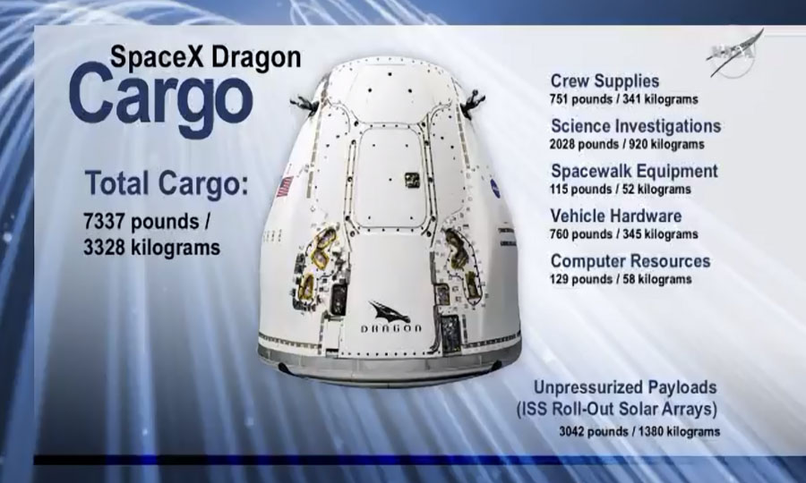 The resupply mission delivers new ISS Roll-out Solar Arrays to the space station in the trunk of the Dragon spacecraft.