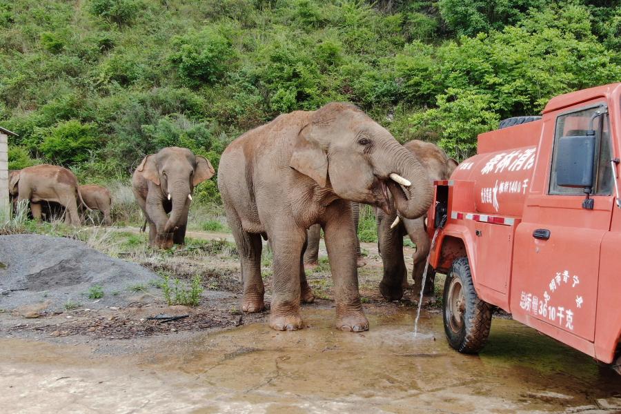 Photo shows a fire engine providing drinking water for the herd in the Jinning District of Kunming, capital of southwest China's Yunnan Province, on June 3, 2021. (On-site command center for the herd's migration/Handout via Xinhua)