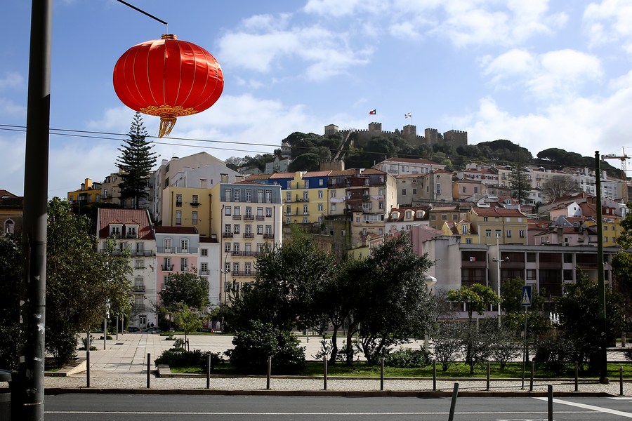 A red lantern set for Chinese Lunar New Year is seen at Martin Moniz square in Lisbon, Portugal, on Feb. 12, 2021. (Photo by Pedro Fiuza/Xinhua)