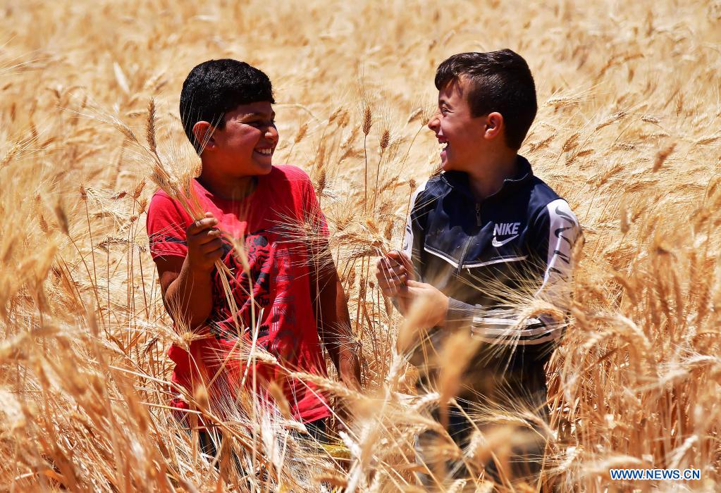Syrian boys harvest wheat in the countryside of Damasus, Syria on June 6, 2021. (Photo by Ammar Safarjalani/Xinhua)