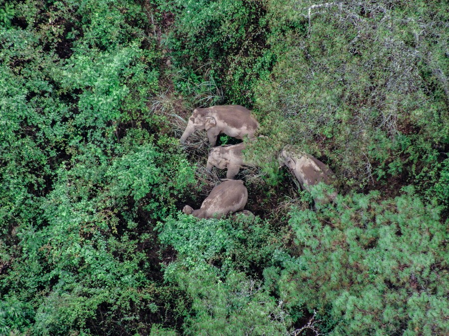 Aerial photo taken on June 5, 2021 shows wild Asian elephants in Jinning District of Kunming, southwest China's Yunnan Province. (Xinhua)