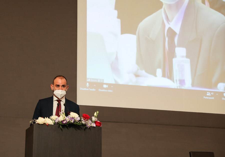 Luca Rizzo Nervo, a member of the Italian Parliament who sits on the Health Committee of the lower house, speaks during the China-Europe Seminar on Human Rights in Rome, Italy, on June 8, 2021. Chinese and European experts and officials meeting here at the seminar on human rights in pandemic stressed that health is the first and foremost human right. (Xinhua/Cheng Tingting)