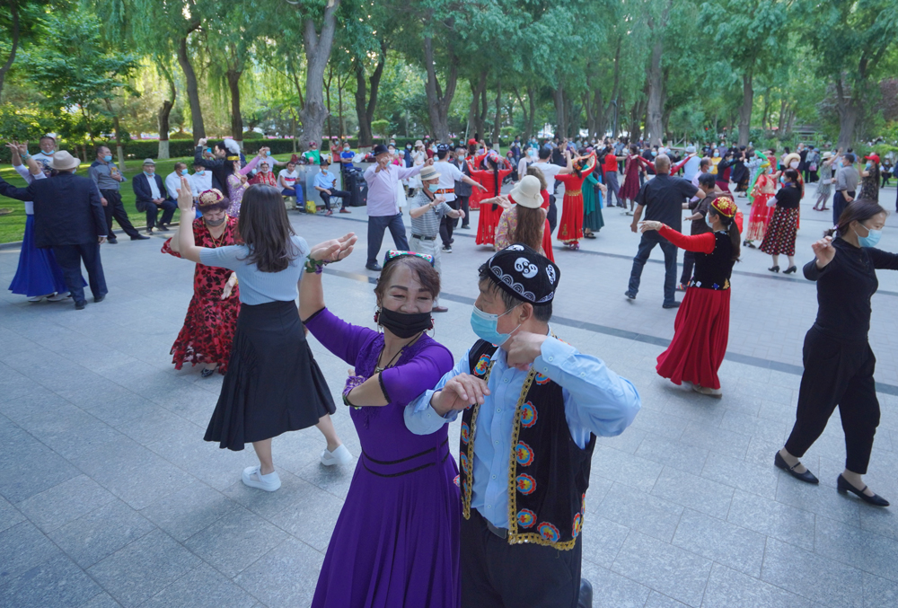 People in ethnic costumes dance at People's Square in Korla, northwest China's Xinjiang Uygur Autonomous Region, May 23, 2021. (People's Daily Online/Zhang Ruohan)